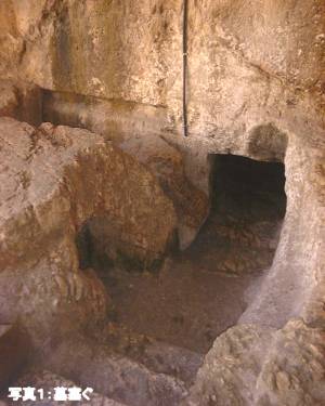 墓の入り口に大きな石を転がしたとあります(マタイ27.60)。写真(墓塞ぐ)はキリストと同時代の墓の入り口です。手前に階段があります。先に遺体を置く玄室への入り口があります。この入り口が左手の石を転がすことによって塞がるのです。