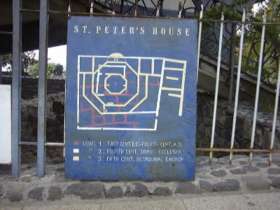 発掘した考古学者の説明です。住居跡はキリストがガリレア宣教の拠点としたペトロの家で、キリスト教時代になって、ペトロの家の跡地に信者のための聖堂が建ち、その後、ビザンチン最盛期に、キリストのガリレア宣教拠点を記念するため「八角形記念聖堂」に建て替えたと言うものです。ルーツがキリスト復活大聖堂内の「八角形キリスト埋葬・復活記念聖堂(お墓)」であることは確かです。